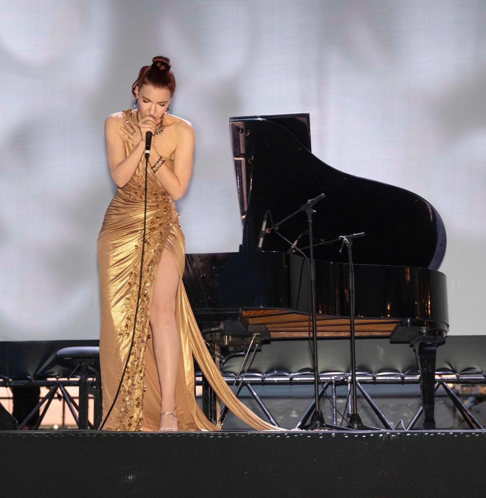 Chrystabell wears Tess Mann Atelier on stage at Tribute to David Lynch and Cerrone in Cannes, France.
